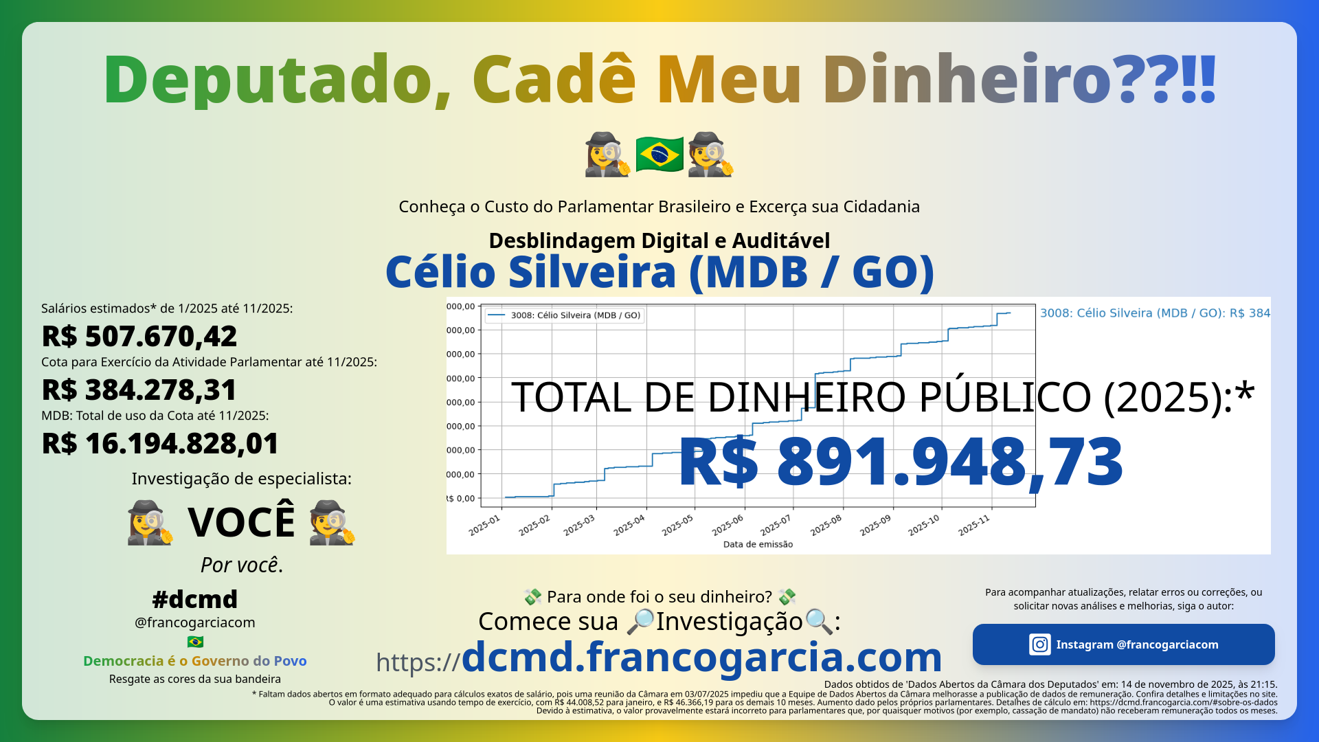 Em 2025, quanto Célio Silveira (MDB/GO) e o MDB usaram do seu dinheiro com a Cota para Exercício da Atividade Parlamentar?