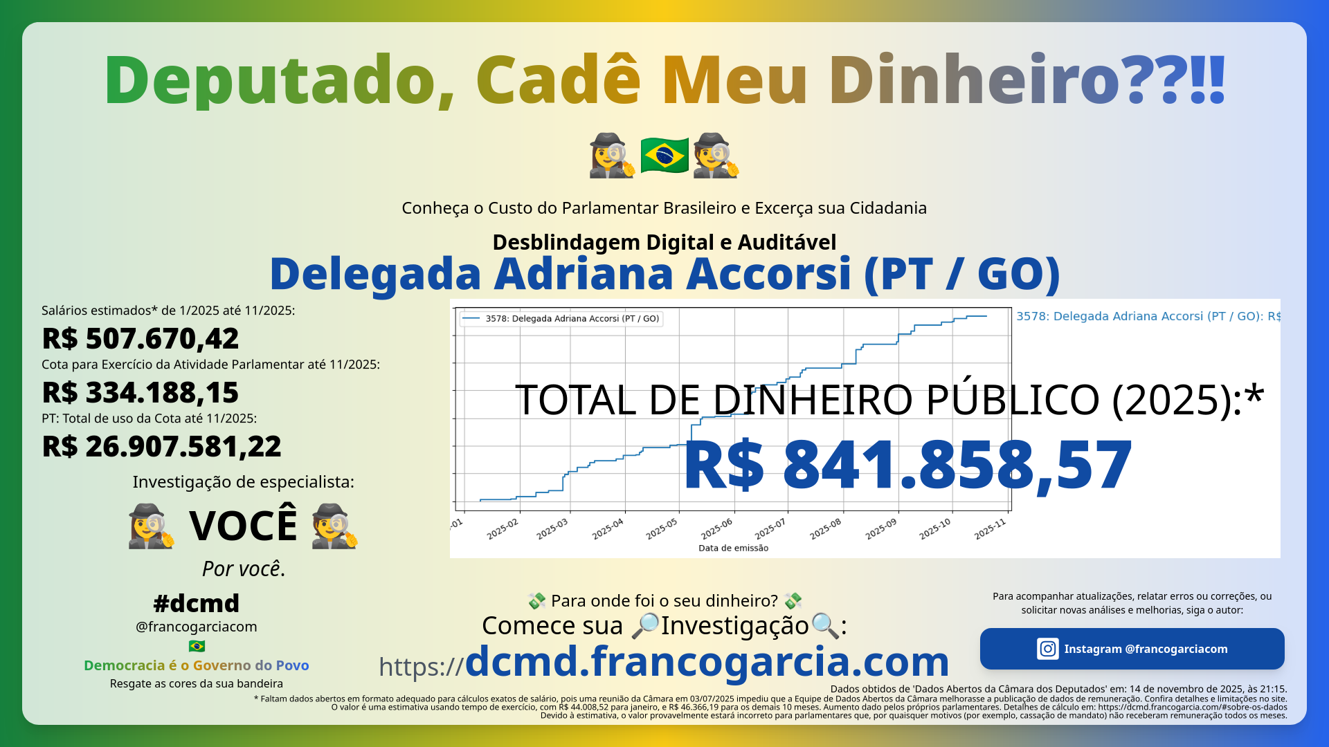 Em 2025, quanto Delegada Adriana Accorsi (PT/GO) e o PT usaram do seu dinheiro com a Cota para Exercício da Atividade Parlamentar?