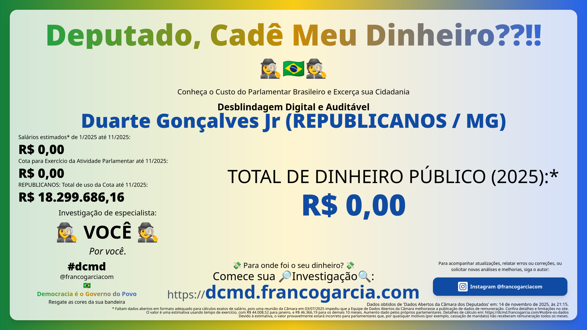 Duarte Gonçalves Jr (REPUBLICANOS/MG) não possui gastos em 2025 com a Cota Parlamentar até a data da geração da página (com dados obtidos em 14/11/2025 21h15min).