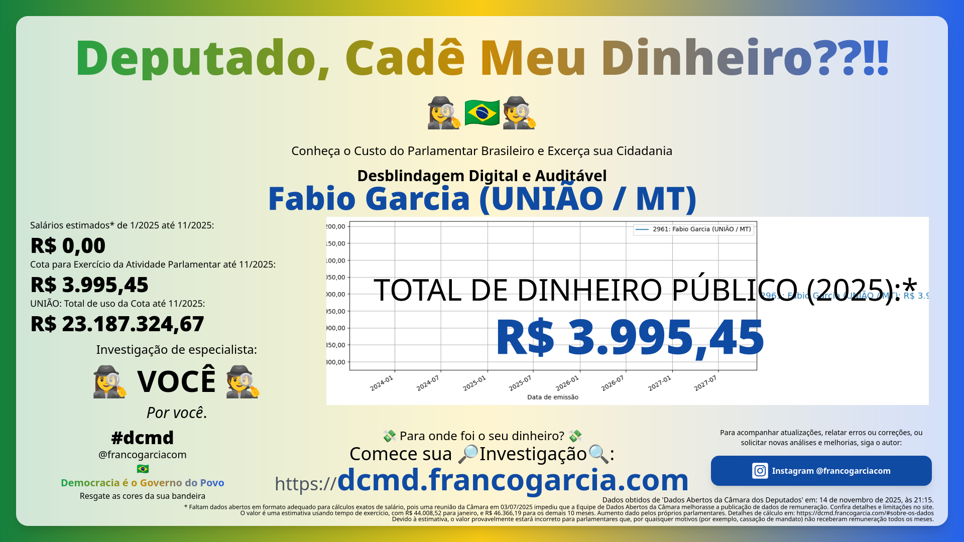 O que você recebeu em troca das despesas com Fabio Garcia (UNIÃO/MT)? Você está satisfeita ou satisfeito com o desempenho do parlamentar? O Brasil melhorou com as propostas, projetos de lei, e votos do parlamentar? Seu dinheiro foi bem investido?