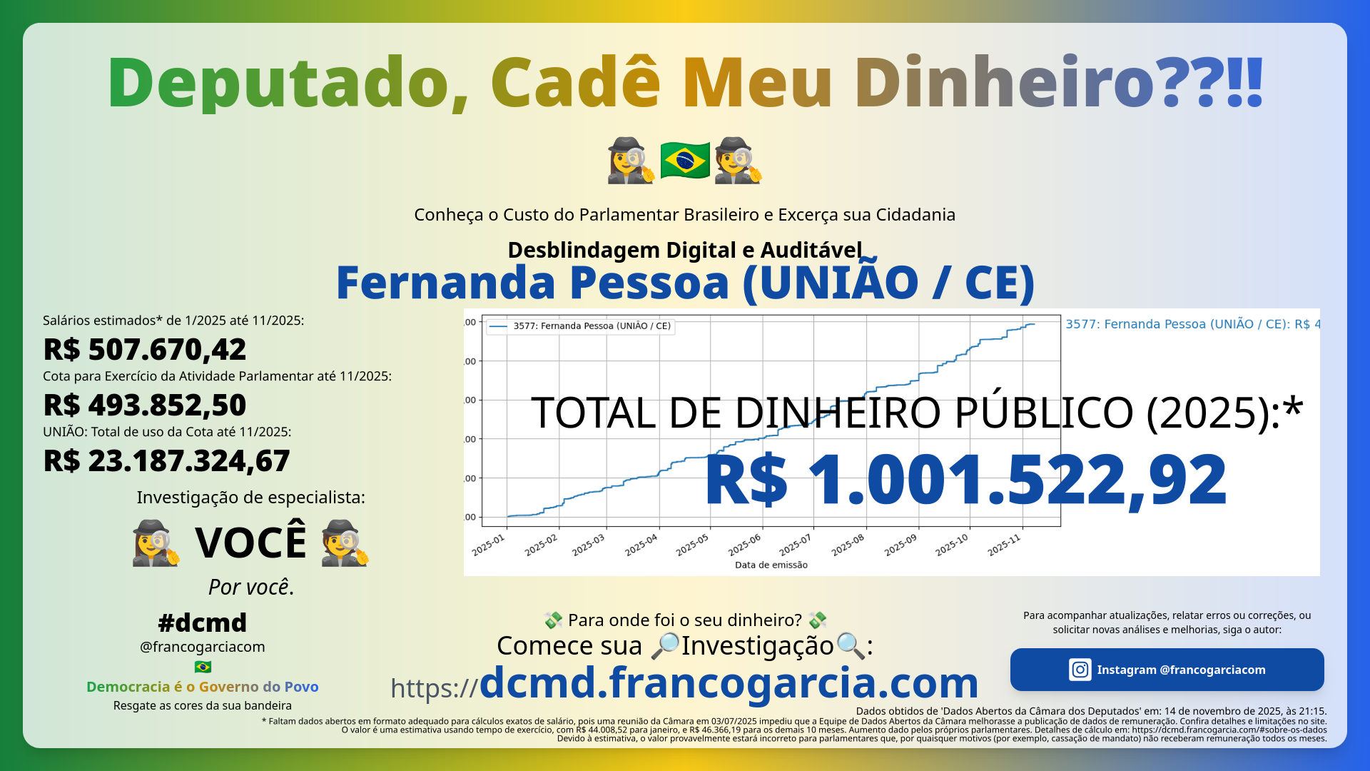 O que você recebeu em troca das despesas com Fernanda Pessoa (UNIÃO/CE)? Você está satisfeita ou satisfeito com o desempenho do parlamentar? O Brasil melhorou com as propostas, projetos de lei, e votos do parlamentar? Seu dinheiro foi bem investido?