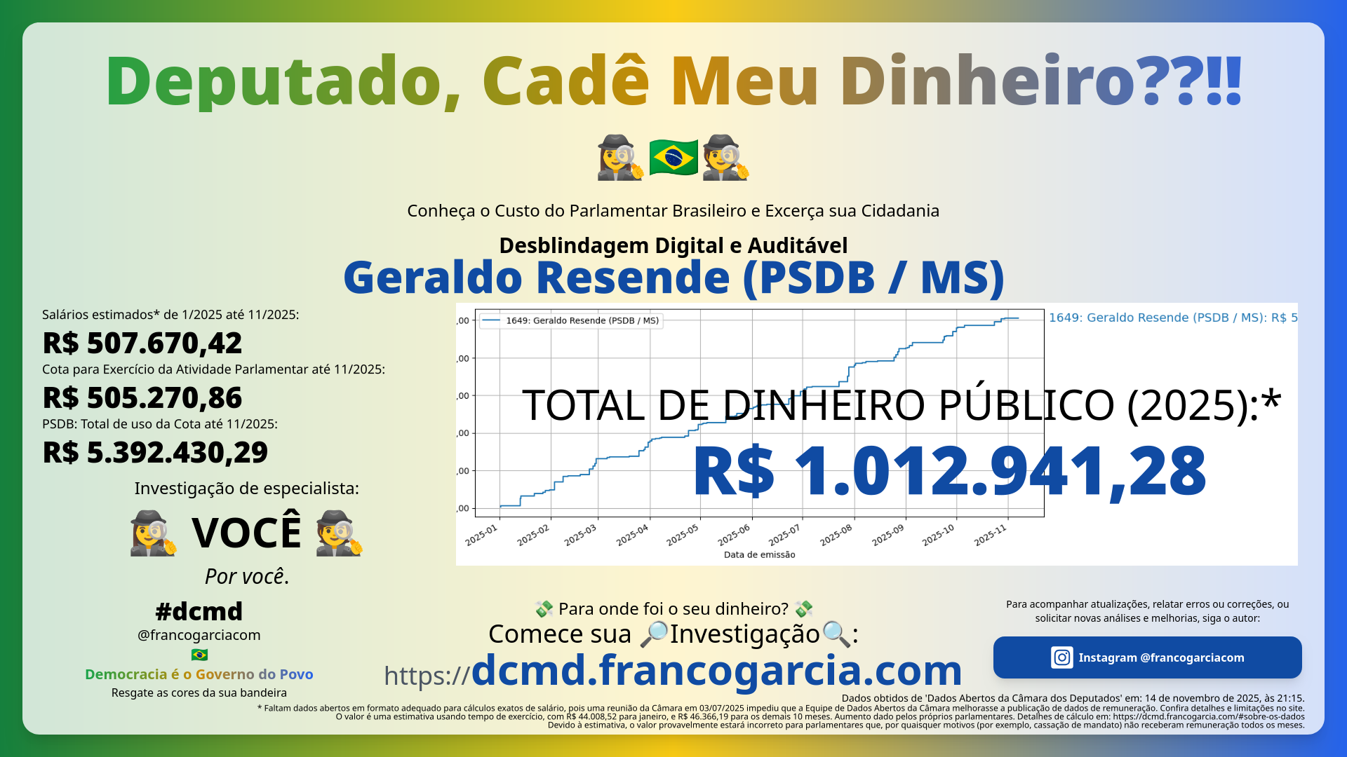 O que você recebeu em troca das despesas com Geraldo Resende (PSDB/MS)? Você está satisfeita ou satisfeito com o desempenho do parlamentar? O Brasil melhorou com as propostas, projetos de lei, e votos do parlamentar? Seu dinheiro foi bem investido?
