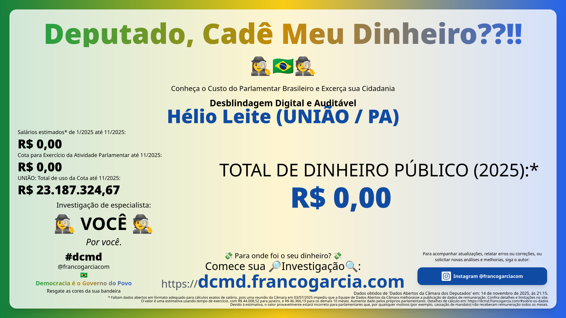Hélio Leite (UNIÃO/PA) não possui gastos em 2025 com a Cota Parlamentar até a data da geração da página (com dados obtidos em 14/11/2025 21h15min).
