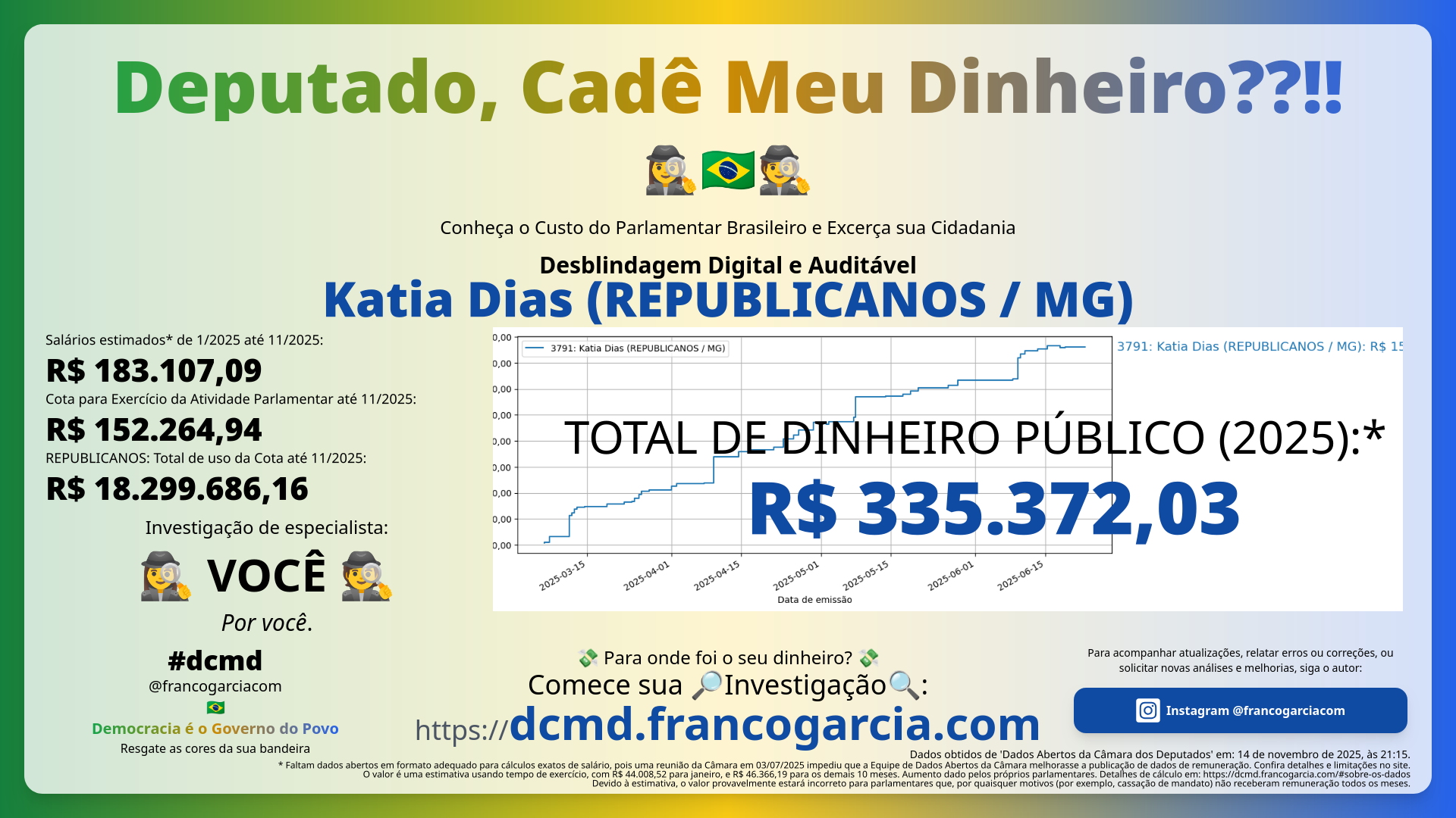 Os dados analisados não informam como se usou o dinheiro público. Portanto, considerando-se apenas os dados, Franco Eusébio Garcia pressupõe (não afirma, nem nega) que Katia Dias usou todos os recursos de boa-fé e em benefício do povo brasileiro.