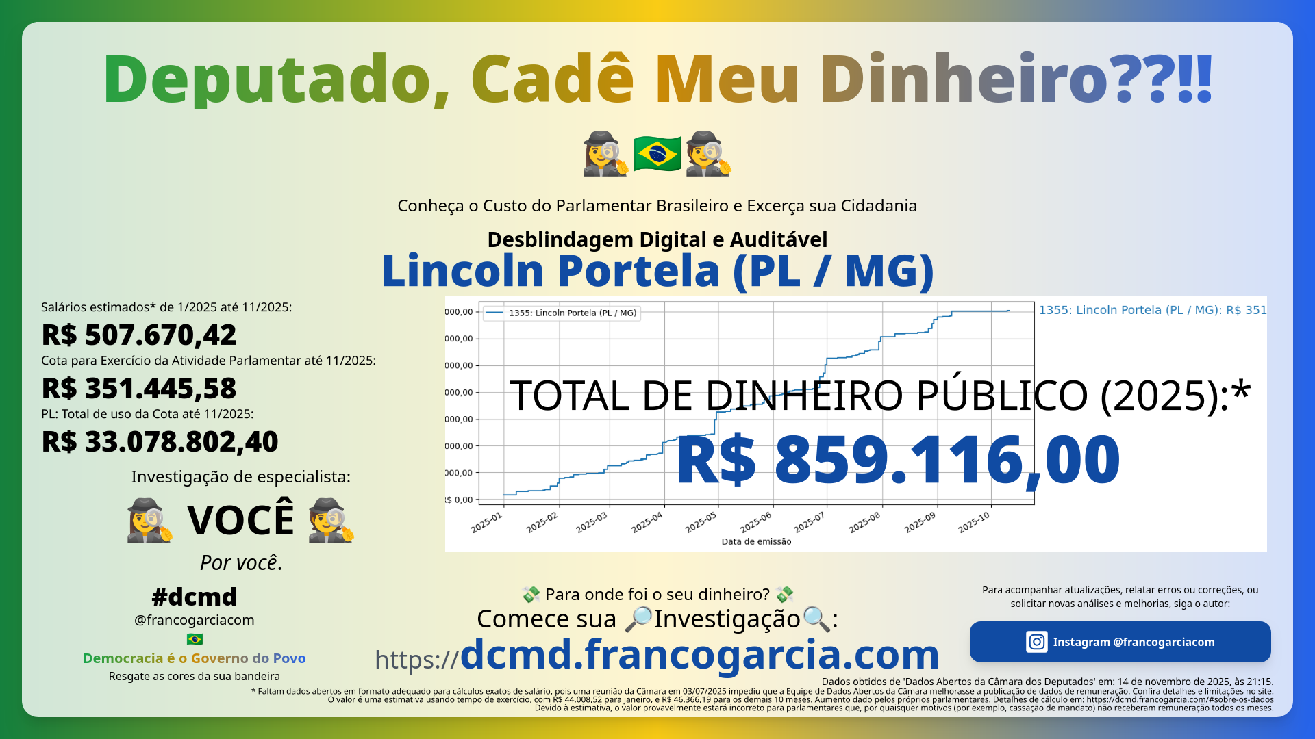 O que você recebeu em troca das despesas com Lincoln Portela (PL/MG)? Você está satisfeita ou satisfeito com o desempenho do parlamentar? O Brasil melhorou com as propostas, projetos de lei, e votos do parlamentar? Seu dinheiro foi bem investido?