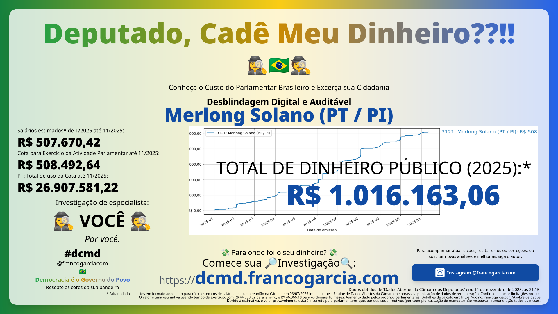 Em 2025, quanto Merlong Solano (PT/PI) e o PT usaram do seu dinheiro com a Cota para Exercício da Atividade Parlamentar?