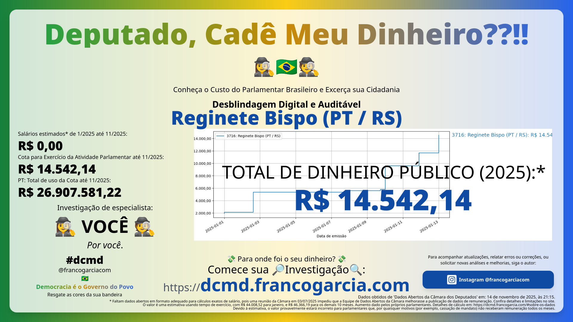 Os dados analisados não informam como se usou o dinheiro público. Portanto, considerando-se apenas os dados, Franco Eusébio Garcia pressupõe (não afirma, nem nega) que Reginete Bispo usou todos os recursos de boa-fé e em benefício do povo brasileiro.
