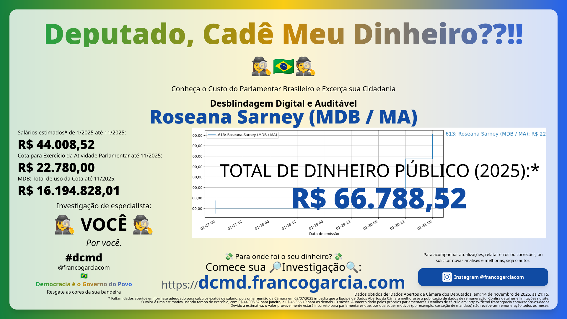 O que você recebeu em troca das despesas com Roseana Sarney (MDB/MA)? Você está satisfeita ou satisfeito com o desempenho do parlamentar? O Brasil melhorou com as propostas, projetos de lei, e votos do parlamentar? Seu dinheiro foi bem investido?