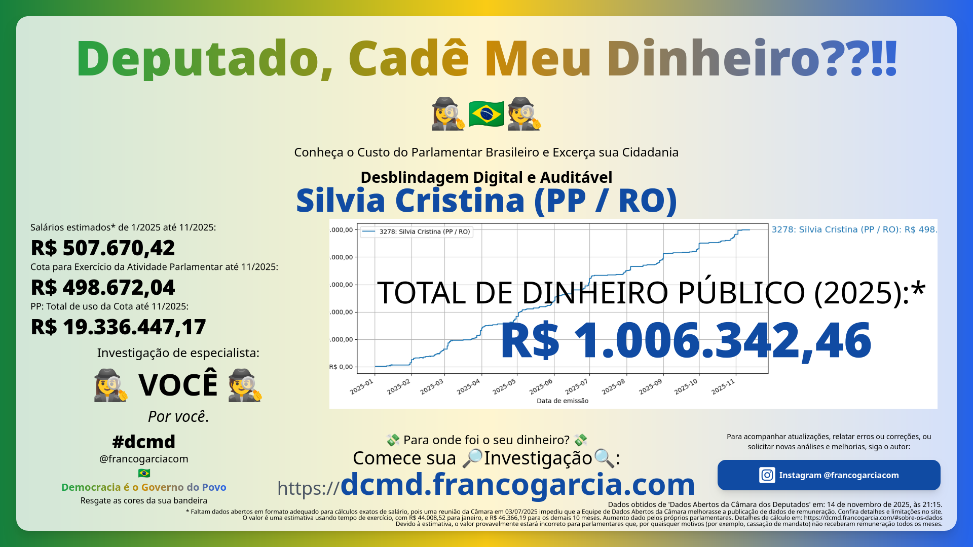 O que você recebeu em troca das despesas com Silvia Cristina (PP/RO)? Você está satisfeita ou satisfeito com o desempenho do parlamentar? O Brasil melhorou com as propostas, projetos de lei, e votos do parlamentar? Seu dinheiro foi bem investido?
