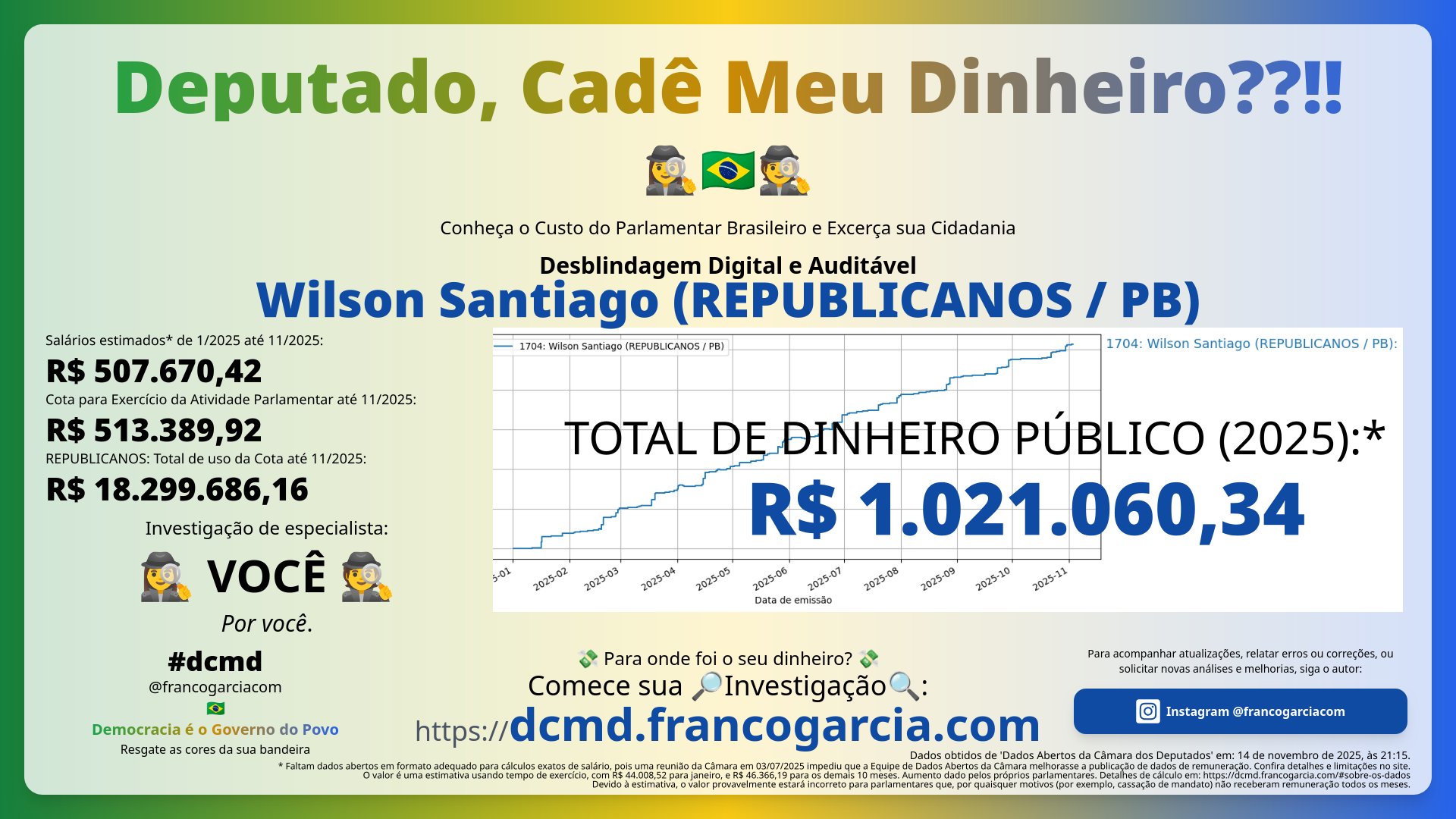 O que você recebeu em troca das despesas com Wilson Santiago (REPUBLICANOS/PB)? Você está satisfeita ou satisfeito com o desempenho do parlamentar? O Brasil melhorou com as propostas, projetos de lei, e votos do parlamentar? Seu dinheiro foi bem investido?