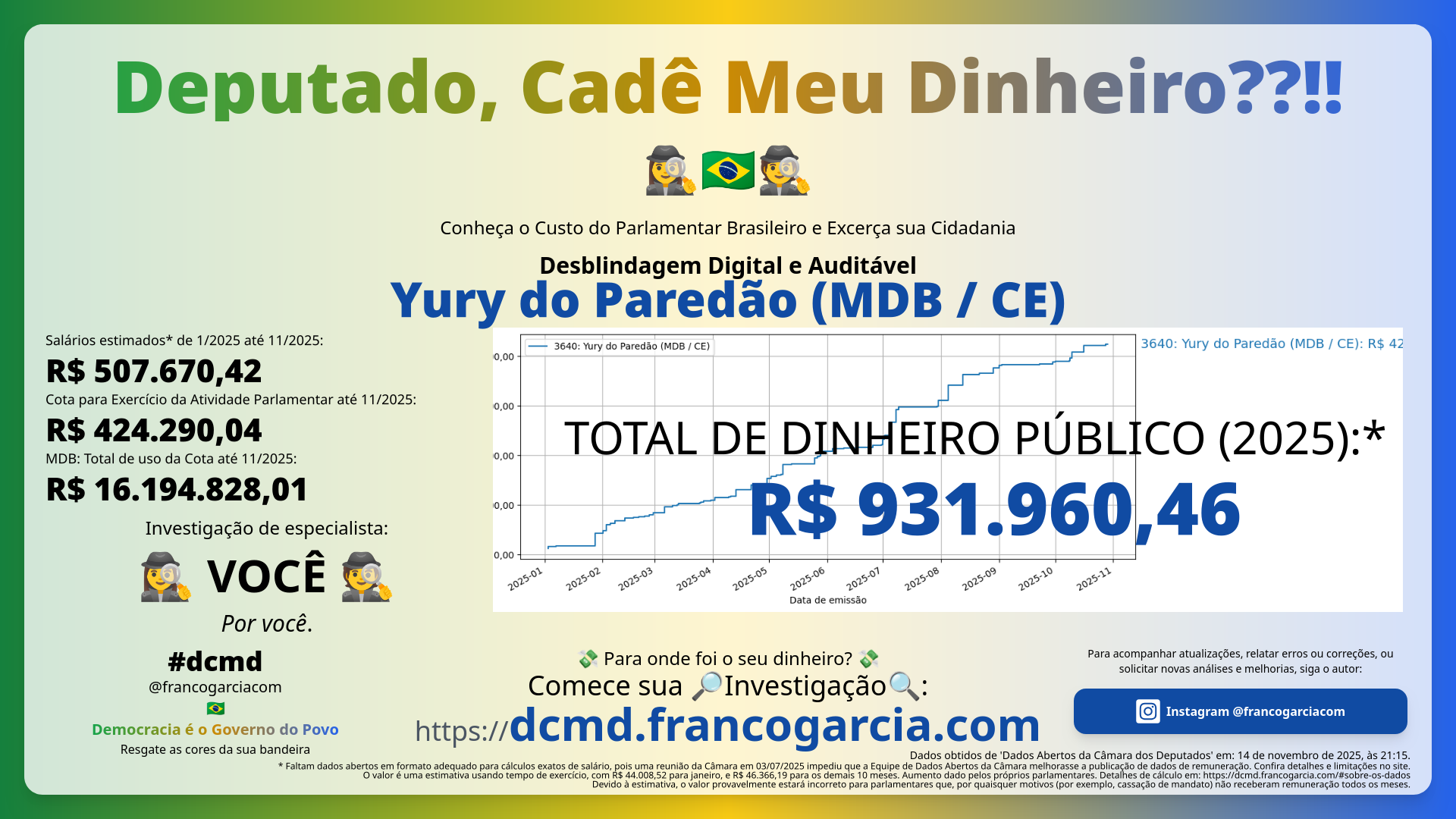 Em 2025, quanto Yury do Paredão (MDB/CE) e o MDB usaram do seu dinheiro com a Cota para Exercício da Atividade Parlamentar?